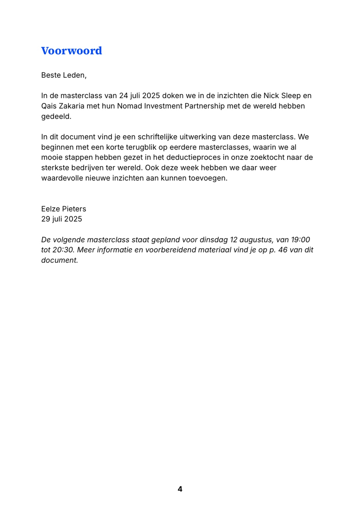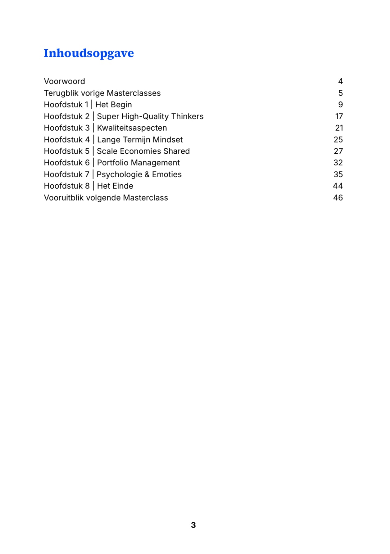 In dit document vind je een schriftelijke uitwerking van deze masterclass. We beginnen met een korte terugblik op eerdere masterclasses, waarin we al mooie stappen hebben gezet in het deductieproces in onze zoektocht naar de sterkste bedrijven ter wereld. Met deze masterclass voegen we daar weer waardevolle nieuwe inzichten aan toe.